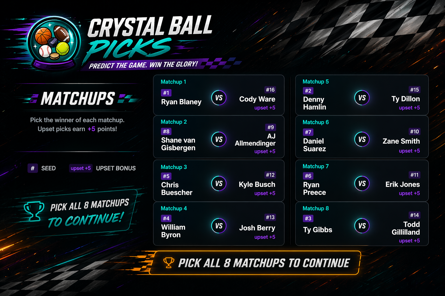 - Upset bonus: +5 points when you correctly pick a lower-seeded driver to beat a higher-seeded driver