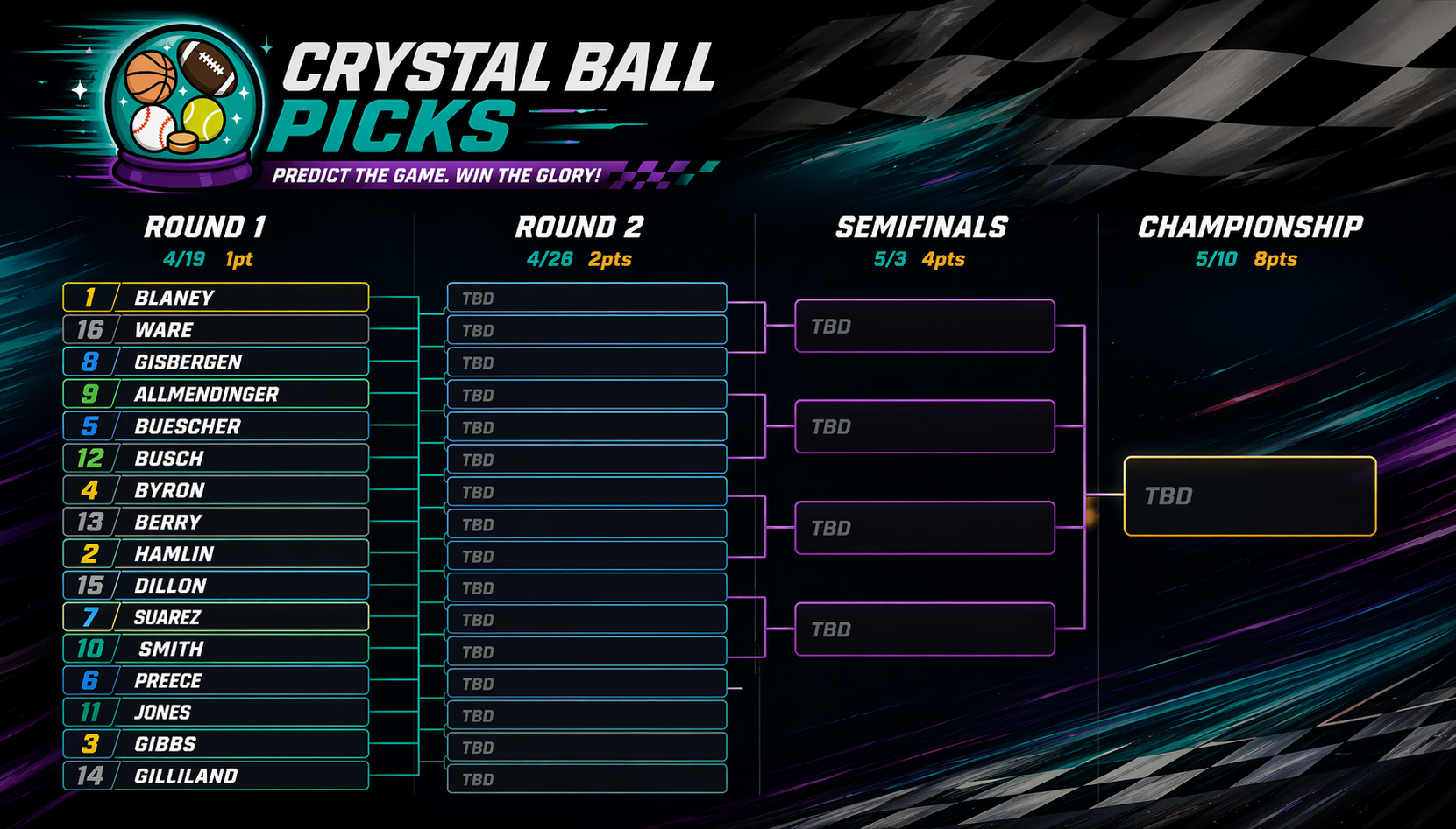 The best part: you do not have to predict the entire bracket before the first race. You make picks round by round, using new information each week.