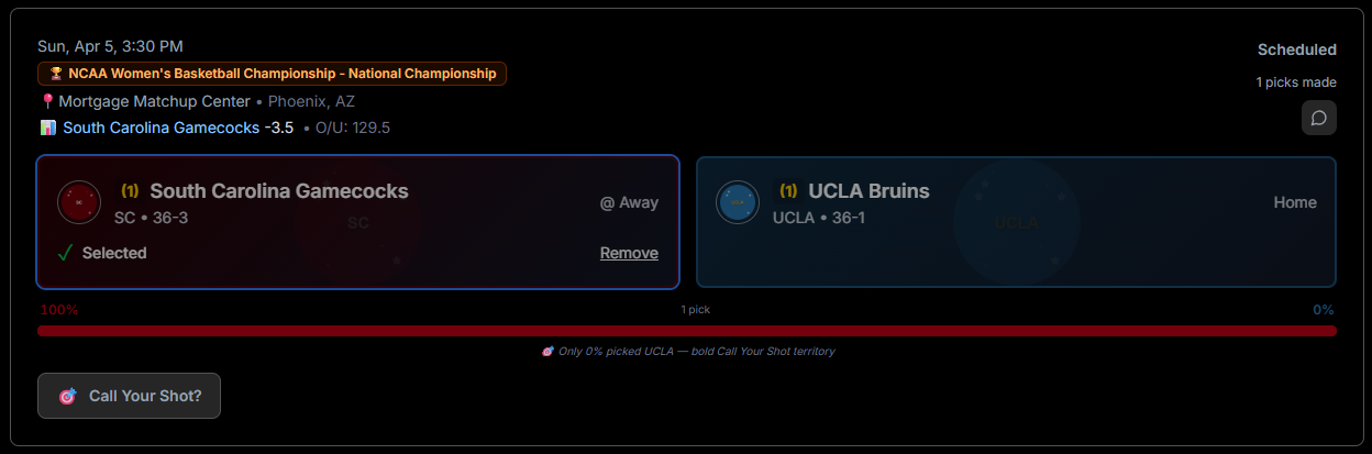 100% of picks are on South Carolina. Not a single person has taken UCLA ā though the app did flag it as bold "Call Your Shot" territory for anyone feeling brave enough to go against the grain.